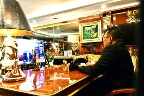 Ketua MPR, Bambang Soesatyo menjadi pembicara utama dalam `Dialog Bersama Partai Politik di Negara-Negara Asia Selatan dan Asia Tenggara`, secara daring dari Ruang Kerja Ketua MPR RI, di Jakarta, Kamis (9/9/21).. (Foto: MPR)