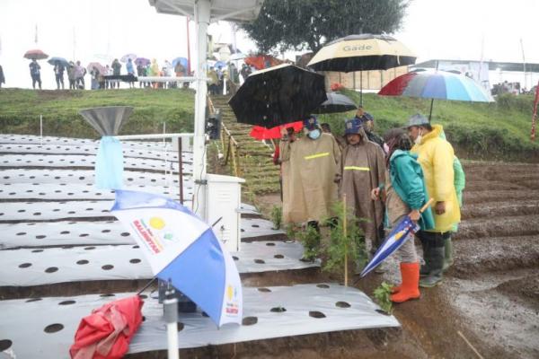 Di bawah hujan deras, Mentan Syahrul menyatakan bahwa dirinya menginginkan dua kabupaten di Pulau Jawa, yakni Temanggung dan Wonosobo mampu menjadi penggerak perekonomian bangsa.
