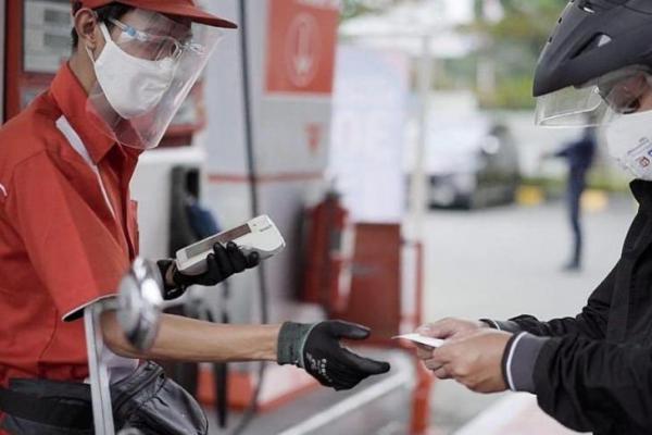 Pelanggan menggunakan aplikasi MyPertamina untuk bertransaksi di SPBU.