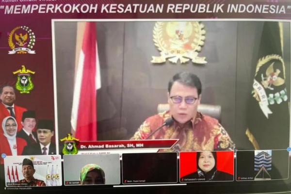Wakil Ketua MPR, Ahmad Basarah menjadi pembicara di Kuliah Umum Universitas Hasanuddin, Makassar, bertema `Memperkokoh Kesatuan Republik Indonesia` secara virtual, Selasa (30/11). (Foto: MPR)