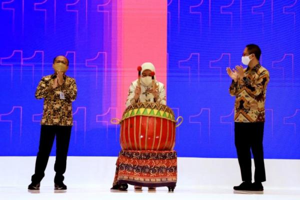 Menteri Ketenagakerjaan, Ida Fauziyah memukul bedug pada acara Kick Off Employment Working Group (EWG) Indonesia G20 Presidency 2022 di Jakarta, Kamis (9/12/2021). (Foto: Biro Humas Kemnaker)
