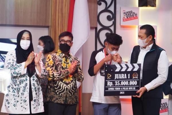 Ketua MPR, Bambang Soesatyo menyerahkan hadiah kepada pemenang Ajang Karya Video 4 Pilar MPR RI, di Jakarta, Jumat (10/12/21). (Foto: MPR)