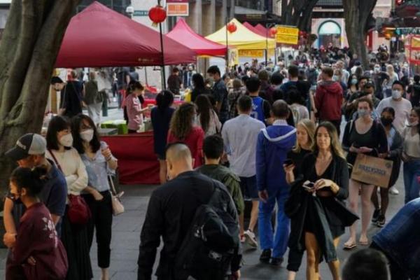 FOTO FILE: Orang-orang berjalan melalui pasar jalanan di pusat kota, ketika tingkat vaksinasi penyakit coronavirus (COVID-19) terus meningkat, di Sydney, Australia, 19 November 2021. REUTERS/Loren Elliott