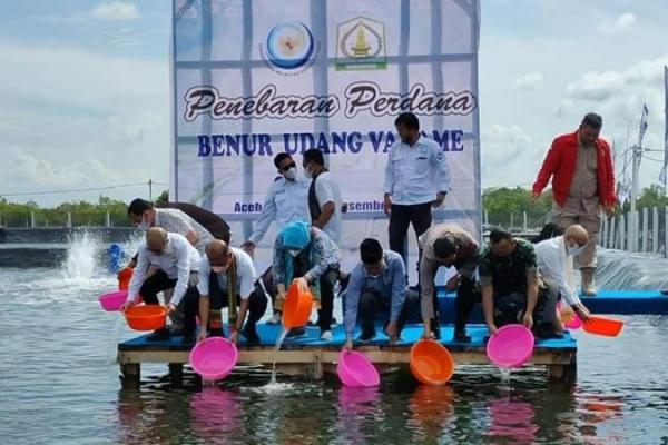 Penebaran 2 juta ekor benur udang saat peresmian klaster tambak udang vaname berkelanjutan di Kabupaten Aceh Tamiang, Provinsi Aceh. (Foto: Humas KKP)