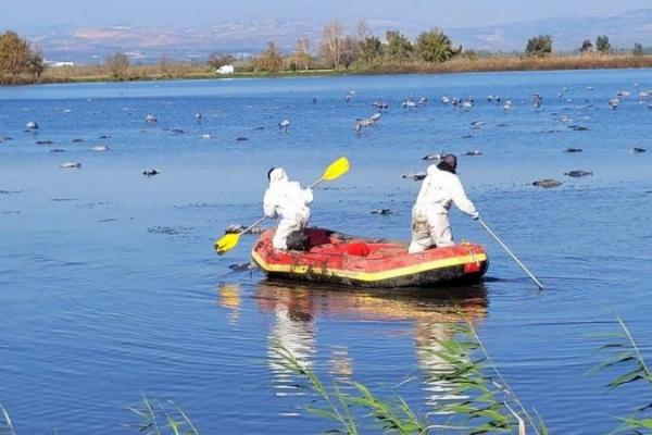 Gambar yang diterbitkan oleh Otoritas Alam dan Taman Israel menunjukkan penjaga dengan pakaian pelindung menggunakan sampan, untuk mengambil bangau yang mati dari Danau Hula untuk mencegah satwa liar lainnya terinfeksi.