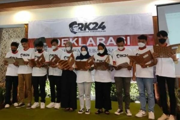 Jakarta, Jurnas.com - Sejumlah elemen pemuda di Jawa Barat, mendeklarasikan Relawan Kebangsaan 2024 atau RK24, di Kota Bandung, Rabu (29/12), sebagai simpul pergerakan masyarakat untuk mendorong dan mendeklarasikan Ridwan Kamil maju sebagai calon presiden (capres) pada Pemilu 2024.