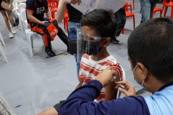Seorang petugas kesehatan menginokulasi Liam Kristov Ocampo, 12, di pusat vaksinasi, di tengah wabah penyakit virus corona (COVID-19), di San Juan City, Metro Manila, Filipina. REUTERS/Peter Blaza