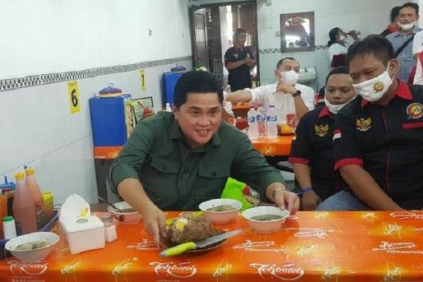 Menteri BUMN Erick Thohir mencicipi bakso granat di Pondok Bakso Mas Dawer, Desa Jatireja, Kecamatan Cikarang Timur, Kabupaten Bekasi, Jawa Barat. (Jurnas/Ist)