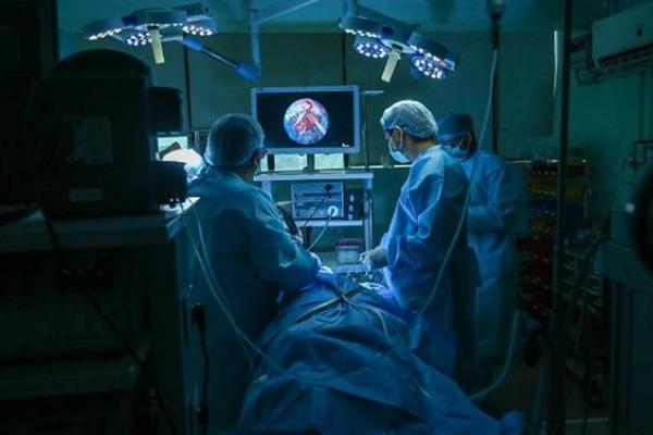 Ahli bedah menghilangkan jamur hitam dari seorang pasien di sebuah rumah sakit di kota Ghaziabad, India. (Foto: AFP/Prakash Singh)