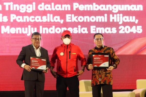 Hasto mengupas tentang konsep green economy yang sudah digagas para pendiri bangsa saat memberikan Kuliah Umum berjudul "Peran Perguruan Tinggi dalam Pembangunan Ekonomi Hijau dan Digital Menuju Indonesia Emas 2045" di Universitas Negeri Surabaya (Unesa), Surabaya, Jawa Timur, Jumat (25/2/2022).