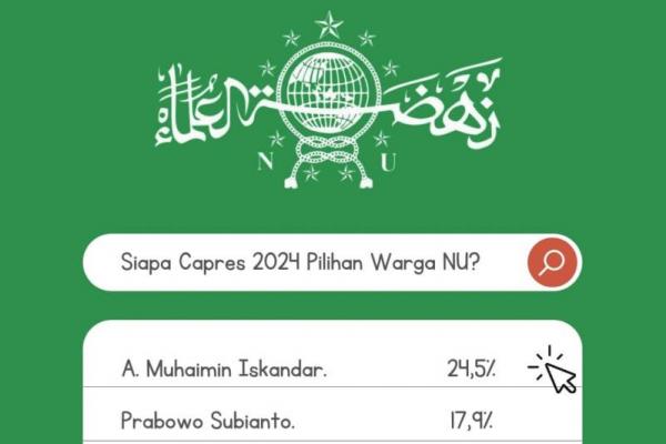 “Nama Muhaimin Iskandar menjadi idola warga NU dengan raihan sebesar 24,5%, disusul Prabowo Subianto sebesar 17,9%. Sementara pada posisi ketiga ditempati Ganjar Pranowo sebesar 17%,” ujar Peneliti Jaringan Informasi Rakyat, Aji Fadil kepada wartawan di Jakarta, Kamis (7/4/2022).