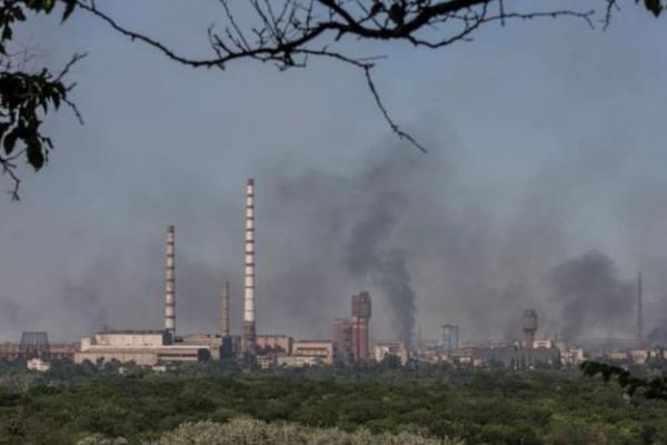 Asap mengepul setelah serangan militer di kompleks Pabrik Kimia Azot Sievierodonetsk, di tengah serangan Rusia ke Ukraina, di kota Lysychansk, wilayah Luhansk, Ukraina, pada 10 Juni 2022. (Foto: Reuters/Oleksandr Ratushniak)