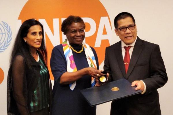 Penghargaan tersebut diserahkan Eksekutif Director United Nations Population Fund (UNFPA), Natalia Kanem A kepada Kepala BKKBN Hasto Wardoyo melalui Deputi Bidang Pelatihan, Penelitian, dan Pengembangan (Lalitbang) BKKBN, Muhammad Rizal Martua Damanik di New York, Amerika Serikat, Selasa (14/6).