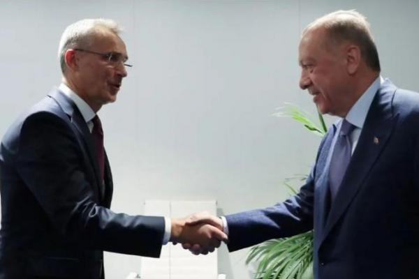 Foto selebaran ini diambil dan dirilis pada 28 Juni 2022 oleh kantor pers Kepresidenan Turki, menunjukkan Presiden Turki Recep Tayyip Erdogan (kanan) berjabat tangan dengan Sekretaris Jenderal NATO Jens Stoltenberg sebelum pembicaraan empat arah tentang aplikasi NATO Swedia dan Finlandia menjelang NATO KTT di Madrid. (AFP)
