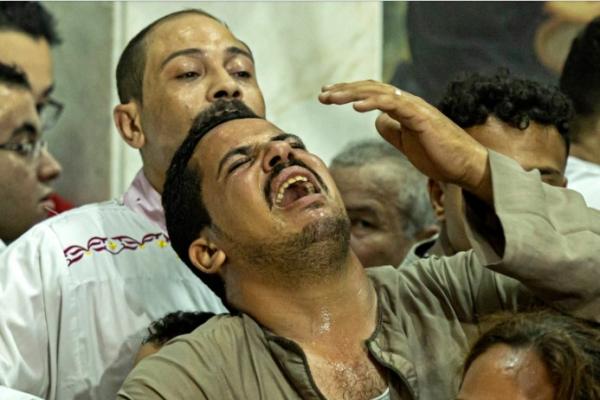 Ratusan orang berkumpul untuk memberikan penghormatan di dalam dan di sekitar dua gereja Giza pada Minggu malam di mana para pendeta berdoa untuk para korban.