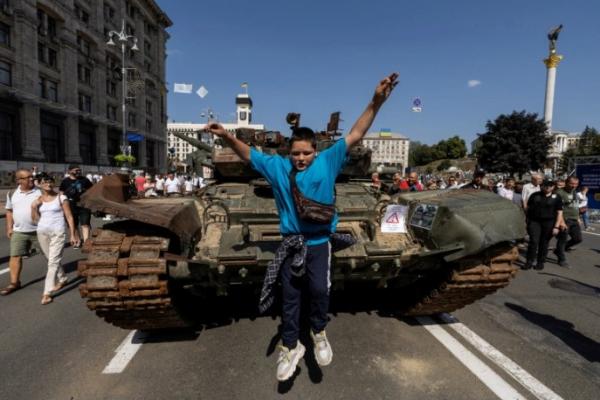 Seorang anak laki-laki melompat dari tank di pameran kendaraan militer dan senjata Rusia yang hancur, didedikasikan untuk Hari Kemerdekaan negara yang akan datang di pusat Kyiv, Ukraina, 21 Agustus 2022 (Valentyn Ogirenko/ Reuters)