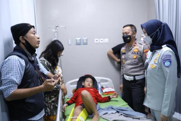 Direktur Operasional PT Jasa Raharja Dewi Aryani Suzana (kanan) saat menjenguk salah satu korban truk kontainer di Bekasi, Jawa Barat. Foto: Jasa Raharja