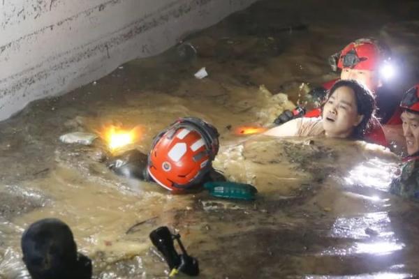 Tim penyelamat harus mengarungi beberapa meter air cokelat untuk memasuki ruang bawah tanah yang hampir sepenuhnya terendam pada Selasa (6/9) malam.