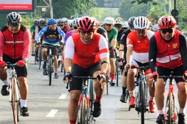 Sekjen PDIP Hasto Kristiyanto bersama sejumlah kepala daerah saat Gowes di Surabaya.