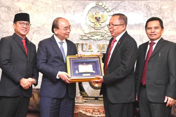 Pimpinan MPR RI Arsul Sani dan Yandri Susanto menerima Presiden Vietnam Nguyen Xuan Phuc di Ruang Kerja Ketua MPR RI, Kamis sore (22/12/22). (Foto: Humas MPR)