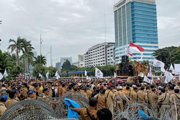 Aksi menuntut kejelasan terkait status kepegawaian perangkat desa oleh Persatuan Perangkat Desa Indonesia (PPDI) berlangsung di depan gedung DPR RI Jakarta, Rabu (25/1). (Foto: Dok. Ist)