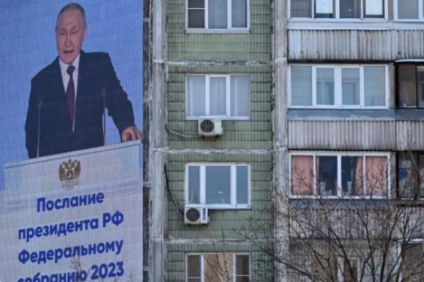 Presiden Rusia Vladimir Putin terlihat di layar luar pada fasad sebuah bangunan menyampaikan pidato kenegaraan tahunannya di Moskow pada 21 Februari 2023. (Foto: AFP/Kirill Kudryavtsev)
