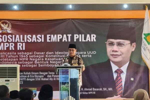 ‘’Apa yang digagas almarhum KH Hasyim Muzadi yang mendirikan pesantren Al-Hikam khusus mahasiswa ini bisa dijadikan pilot project bagaimana kita menghadapi era disrupsi. Saat banyak dunia pendidikan tercerabut dari akar menuju sekulerisme, pendidikan di Indonesia yang berideologi Pancasila harus tetap di jalur ketuhanan yang religius sesuai amanat sila pertama Pancasila,’’ kata Ahmad Basarah, saat menyampaikan sosialisasi Empat Pilar MPR RI di STAI Ma’had Aly Al-Hikam, Malang, Jawa Timur, Selasa (7/3/23).