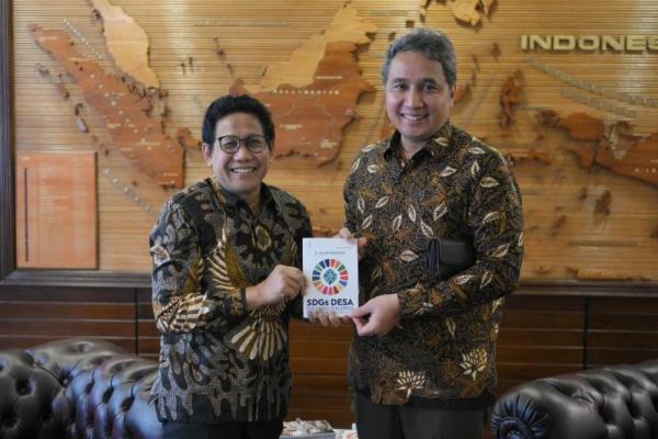 Menteri Desa, Pembangunan Daerah Tertinggal, dan Transmigrasi Abdul Halim Iskandar (Gus Halim) saat menerima audiensi dengan Dirjen Kebudayaan Kemendikbud Ristek Hilmar Farid di ruang kerjanya, Kalibata, Jakarta, Rabu (8/3/2023).
