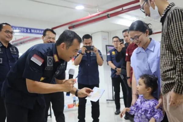 Direktur Jenderal Imigrasi Silmy Karim berinteraksi dengan seorang anak dari pemohon paspor di Unit Pelayanan Percepatan Paspor (UP3) di salah satu pusat perbelanjaan di Jakarta. (Foto Humas Ditjen Imigrasi Kemenkumham)
