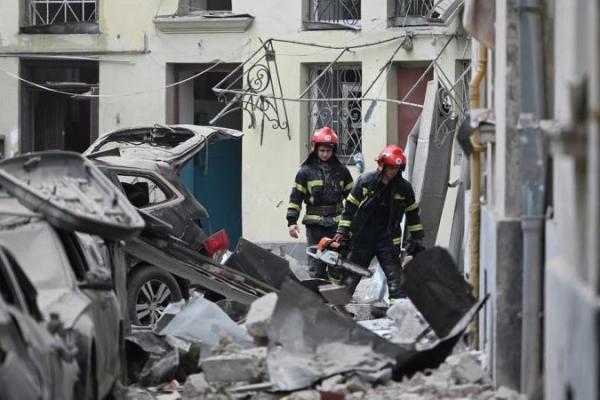 Tim penyelamat bekerja di gedung apartemen yang sebagian hancur akibat serangan rudal di kota Lviv, Ukraina barat, pada 6 Juli 2023, di tengah invasi militer Rusia di Ukraina. Sebuah rudal yang menghantam sebuah blok apartemen di Lviv Ukraina menewaskan empat orang pada 6 Juli, yang menurut walikotanya adalah serangan terbesar terhadap infrastruktur sipil di kota itu sejak dimulainya invasi Rusia. (AFP)