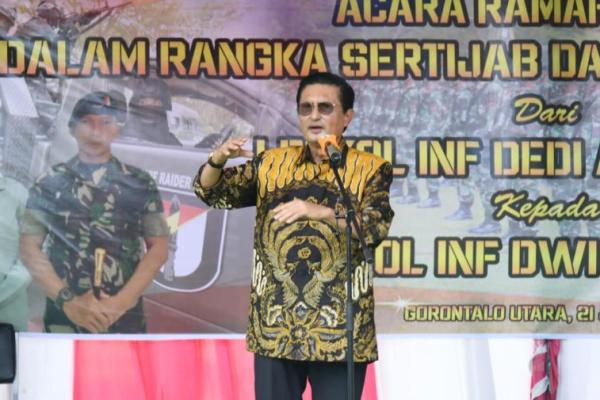 Gorontalo, Jurnas.com - Wakil Ketua MPR Fadel Muhammad memenuhi undangan untuk menghadiri Serah terima jabatan (Sertijab) Komandan Batalyon Infanteri (Inf.) Raider 715/Motuliato dari Letkol. Inf. Dedi Akhiruddin kepada Letkol. Inf. Dwi Hertanto, di Lapangan Markas Yonif R 715/MTL, Kwandang, Gorontalo Utara, Gorontalo, Jumat (21/7/2023).