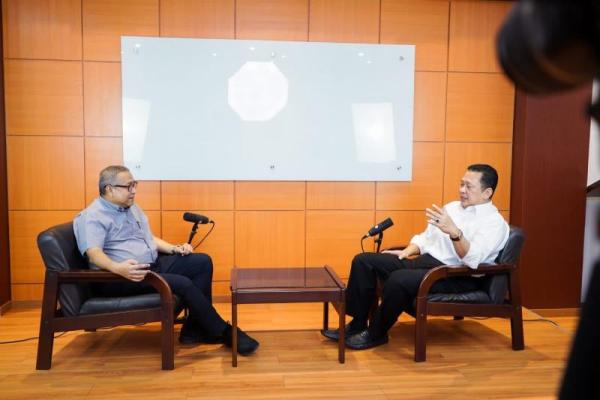 Ketua MPR, Bambang Soesatyo dalam acara podcast Pembaharuan Hukum Nasional bersama Direktur Pascasarjana/Ketua Prodi Doktor Hukum Universitas Borobudur Jakarta Prof. Dr. Faisal Santiago, di Jakarta, Kamis (27/7/23). (Foto: Humas MPR)