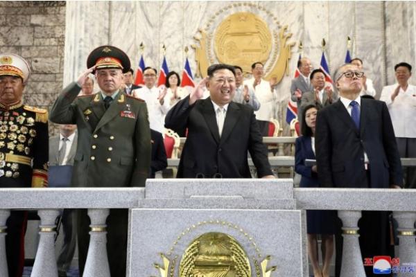 Menteri Pertahanan Rusia, Sergei Shoigu dan pejabat partai berkuasa China, Li Hongzhong, pejabat asing pertama yang mengunjungi Pyongyang sejak pandemi COVID-19, menyaksikan pawai bersama Kim Jong Un dari balkon yang menghadap ke ibu kota.