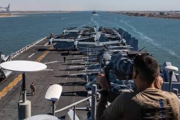 Seorang pelaut Angkatan Laut AS berjaga-jaga di kapal serbu amfibi selama transit melalui Terusan Suez, 6 Agustus 2023. (Korps Marinir AS / Kopral Nayelly Nieves-Nieves)