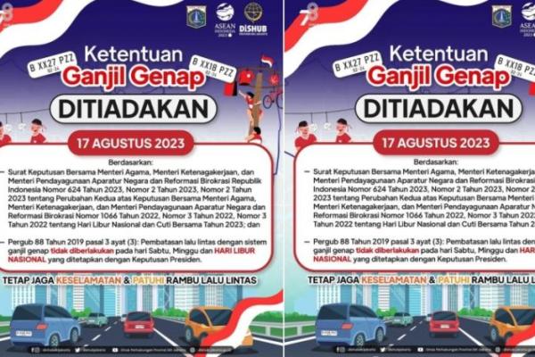 "Sehubungan dengan perayaan Hari Ulang Tahun Kemerdekaan Republik Indonesia pada tanggal 17 Agustus 2023, Ganjil Genap di DKI Jakarta ditiadakan.," tulis akun Instagram resmi Dishub DKI Jakarta @dishubdki, Jumat (11/8/2023).