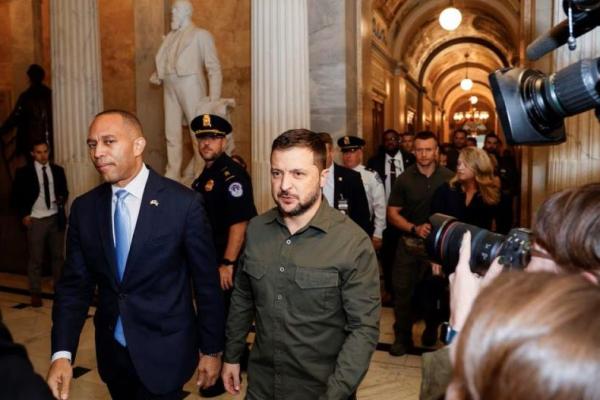 Mengenakan pakaian hijau militer untuk mencerminkan statusnya sebagai pemimpin masa perang, Zelenskiy bertemu dengan para pemimpin Dewan Perwakilan Rakyat yang dipimpin Partai Republik dan komite keamanan nasional DPR.
