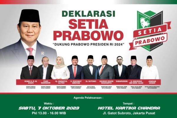 Dalam kesempatan yang sama, Sekretaris Jenderal Setia Prabowo, George Edwin Sugiharto mengungkapkan bahwa Deklarasi 1200 alumni HMI yang tergabung dalam Setia Prabowo pada 7 Oktober 2023 di Hotel Kartika Chandra ini mengawali deklarasi-deklarasi yang segera akan dilakukan di berbagai daerah.