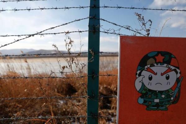 Sebuah kartun tentara sebagai tanda peringatan di kawat berduri perbatasan antara Rusia, China, dan Korea Utara dekat kota Hunchun, China, 24 November 2017. Foto: Reuters