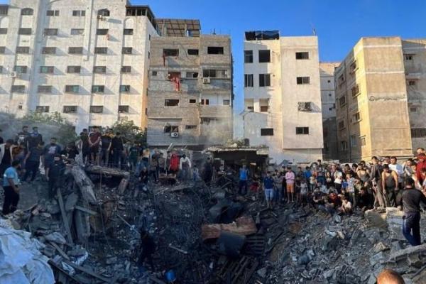 Warga Palestina berkumpul di lokasi serangan Israel terhadap sebuah rumah, di Kota Gaza 21 Oktober 2023. Foto: Reuters
