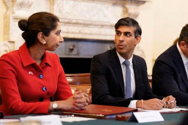 Menteri Dalam Negeri Suella Braverman bersama Perdana Menteri Rishi Sunak di 10 Downing Street, London, Inggris 12 Oktober 2023. Foto via Reuters