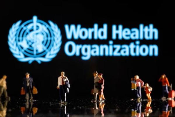 Patung-patung kecil terlihat di depan logo Organisasi Kesehatan Dunia yang ditampilkan dalam ilustrasi yang diambil pada 11 Februari 2022. Foto: Reuters