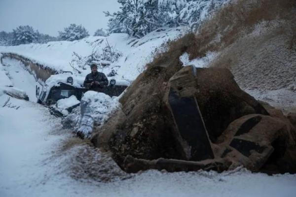Seorang prajurit Ukraina menggali parit anti tank dengan kendaraan rekayasa militer MDK-3, dekat perbatasan Belarus, Ukraina 14 Desember 2023. Foto: Reuters
