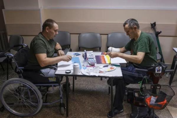 Anggota militer Ukraina yang terluka menggambar selama sesi terapi seni di pusat medis, di Vinnytsia, Ukraina 21 November 2023. Foto: Reuters