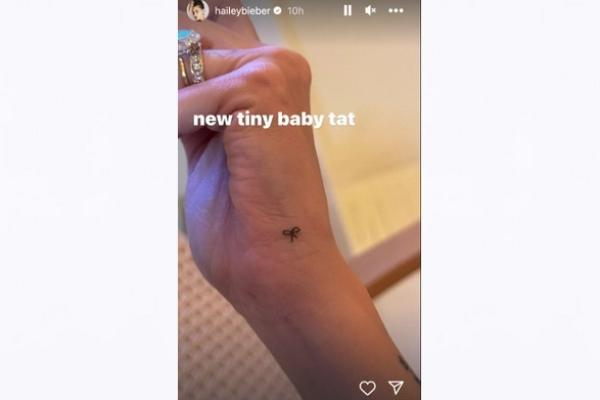 "Tato kecil baru," Hailey Bieber (27), menulis tentang seni gambar tubuh yang berbentuk pita.