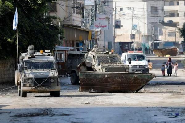 Seorang wanita berjalan bersama anak-anak di samping ambulans selama penggerebekan di Jenin, di Tepi Barat yang diduduki Israel, 14 Desember 2023. Foto: Reuters