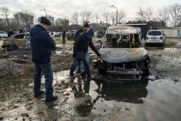 Orang-orang memeriksa mobil yang hancur akibat serangan rudal dan drone Rusia, di Kyiv, Ukraina 29 Desember 2023. Foto: Reuters