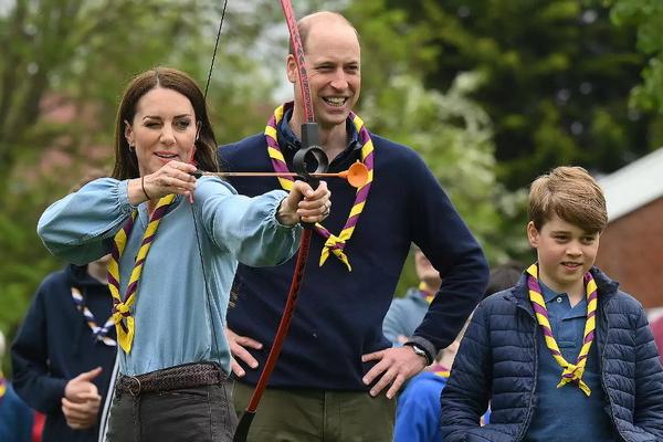 Disaksikan oleh Pangeran William dan Pangeran George, Kate Middleton mencoba memanah saat mengambil bagian dalam Big Help Out, saat berkunjung ke Upton Scouts ke-3 Hut in Slough pada 8 Mei 2023 di London, Inggris. (FOTO: GETTY)