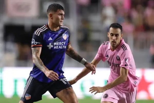 Penyerang FC Cincinnati, Brandon Vazquez, dan gelandang Inter Miami, Sergio Busquets (Foto: Goal)