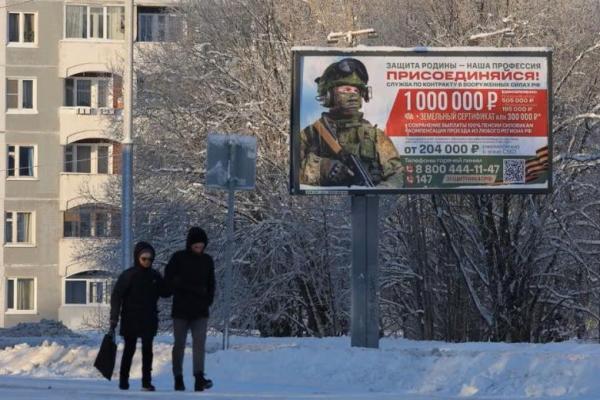 Papan iklan yang mempromosikan dinas militer di bawah kontrak Angkatan Bersenjata Rusia di kota Gatchina di Wilayah Leningrad, Rusia 4 Januari 2024. Foto: Reuters