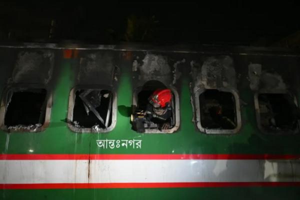 Seorang penyelamat menyalakan obornya dari jendela saat dia mencari gerbong Benapole Express yang hangus di Dhaka, Bangladesh, pada 5 Januari 2024. (FOTO: AFP)